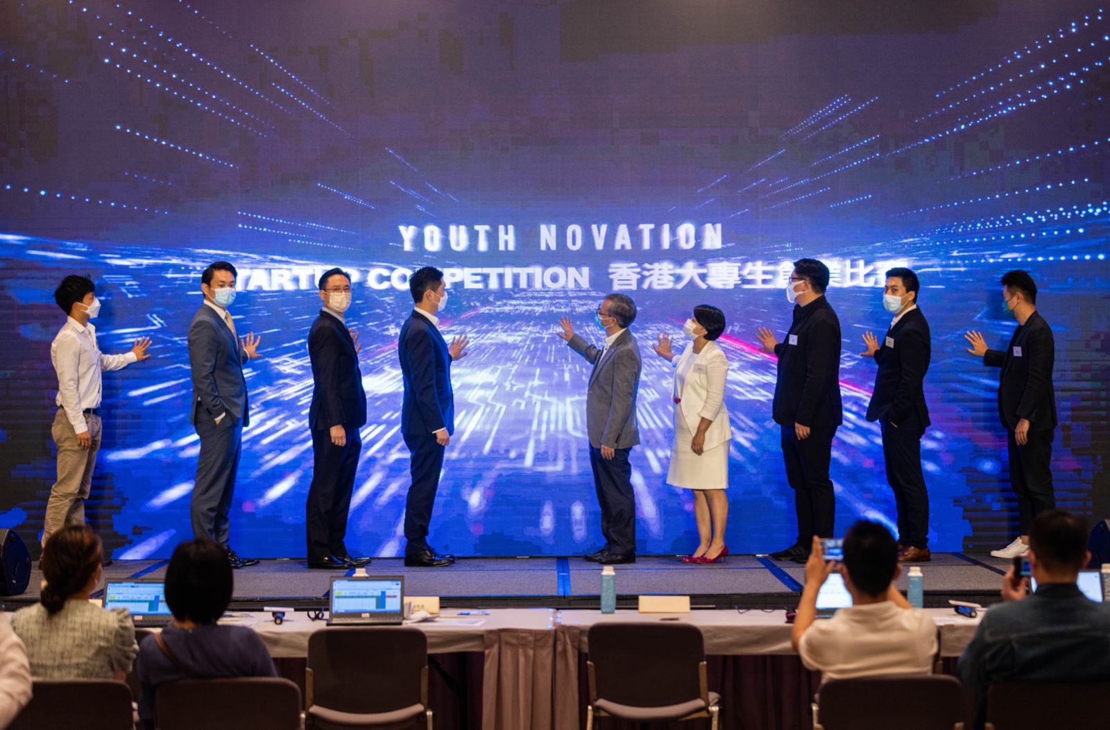 創新及科技局副局長鍾偉强博士, JP、YDAHK 主席劉根森先生、執行主席李培埡女士 及一眾評判一同主持開幕儀式